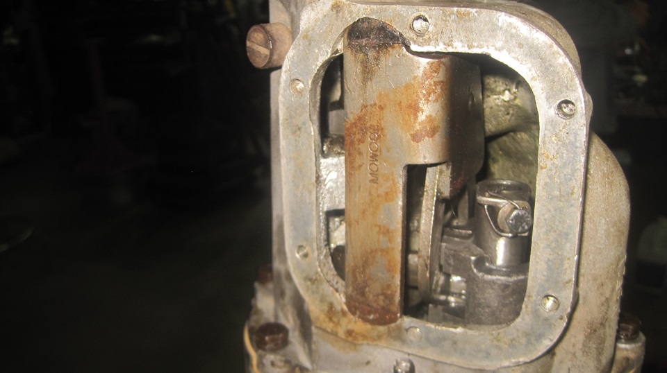 --Oh gawd. Remember the problem with the exhaust manifold and steering column interference? We're not fighting the same problem going back in. Bite the bullet and take time to disconnect the exhaust pipe from the manifold and get the manifold out of the way.Then the engine goes back in much easier. Snuggle it all together, install bellhousing bolts, then the engine mount bolts. the rest is just grunt work, installing manifolds and carburetors. Time out to reinstall the shift extension on the gearbox, reinstall the tunnel top cover. rubber shift boot, shift knob and center carpet.