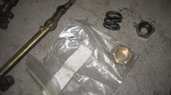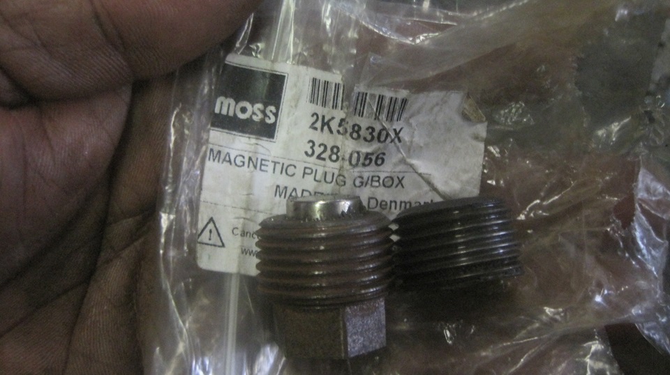 After a short feeling of euphoria, on with the chores. Dismount the clutch slave cylinder and let it hang, Drain the gearbox oil, disconnect the speedometer cable, remove the propshaft, remove gearbox mounting bolt, and pull the gearbox forward. Second slap in the face, cart before the horse, forgot to remove the shift lever, preventing gearbox extraction. Remove the shift knob, pull out the tunnel center carpet section, eight screws to remove tunnel top cover, four bolts to remove the shifter extension assembly. Then we could pull the gear box forward and upward, out over the body nose and set the box on the work cart. Not too bad with three pairs of hands to manhandle the 65 pound gearbox without needing the power lift. Needing to transfer a few parts from the old gearbox to the new one. Grab a new clutch slave pushrod and clevis pin from the Magic Trailer to replace worn parts. Also grab a new magnetic drain plug which we had procured for this special occasion, but quickly discover it is too big to fit the threaded drain port. Curses, have to call Moss Motors about this part later. but for now reinstall the original drain plug and get on with it.