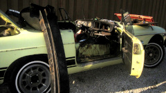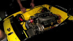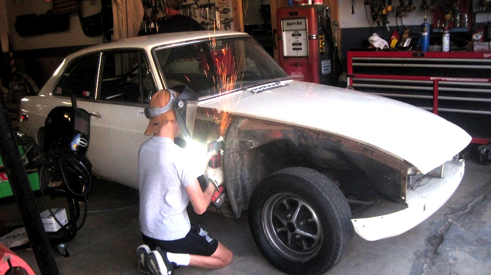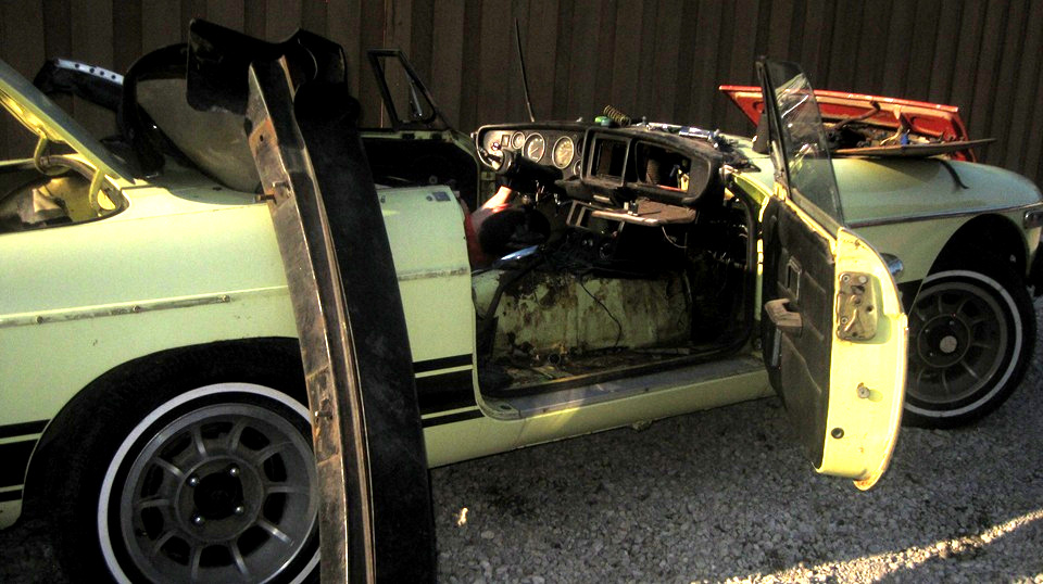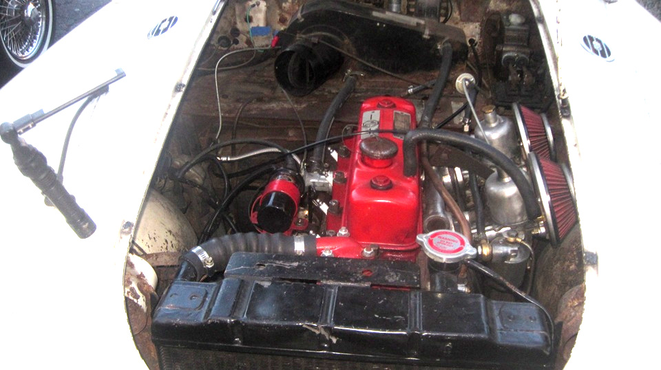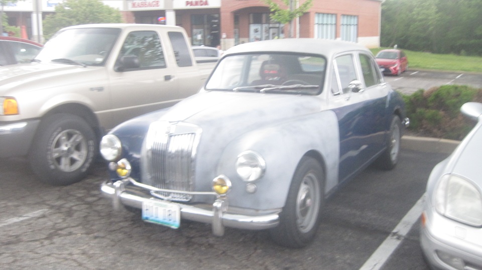 There was the white MGB with the front wings off, which I think is supposed to belong to Tom Raddaz's teen age son as a 'first car". It drove in under its own power, needing some tune-up. They changed spark plugs, then it was running on two cylinders. Good compression, good spark, correct wire order, no fire on 1 and 2. Quick diagnosis, no fuel in the front carburetor. Take the top off the front float chamber for a fuel check. "Don't touch the carburertors, they were fine before we changed the spark plugs". Okay, walk away. Half hour later it was running again. What did they do, besides change spark plugs again? Smack the front float chamber with a wrench. -- Outside an MGB with a weird paint scheme, but a nice fuel injected V6 and 5-speed. Woo-hoo!