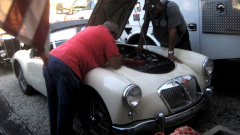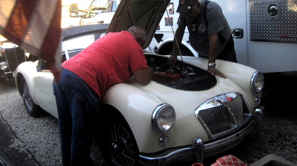 Trying to make believe that is an E-type Jag with no bonnet hiding under the tarp, but no story. That is Sparky's MGA,still misfiring on #2, and still a mystery. They were tightening the fan belt just before leaving, after which it locked up on restart and was smoking the belt without turning the water pump or fan. This turned out to be a broken alternator adjuster bracket that had rotated around to jam up the alternator fan. I offered them a new adjuster bracket from the Magic trailer, but it was declined because they didn't want to take the time to install it. After rotating the broken bracket some more and tightening it down, along with tightening the top mounting bolts, the car left to go home still running on three cylinders with a slightly loose fan belt.