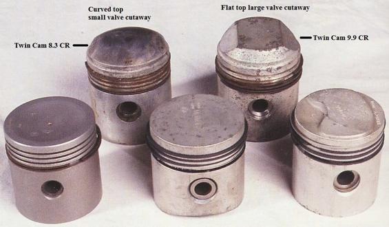 Early morning question from someone about to rebuild a Twin Cam engine, trying to identify the existing pistons (currently low crown 8.1:3 pistons), and decide if the rebuild should be with 8.3:1 or 9:1;1 compression ratio. The answer is, only use low compression if you can't get premium fuel, or if you intend to drive it a lot and want to buy cheaper fuel.