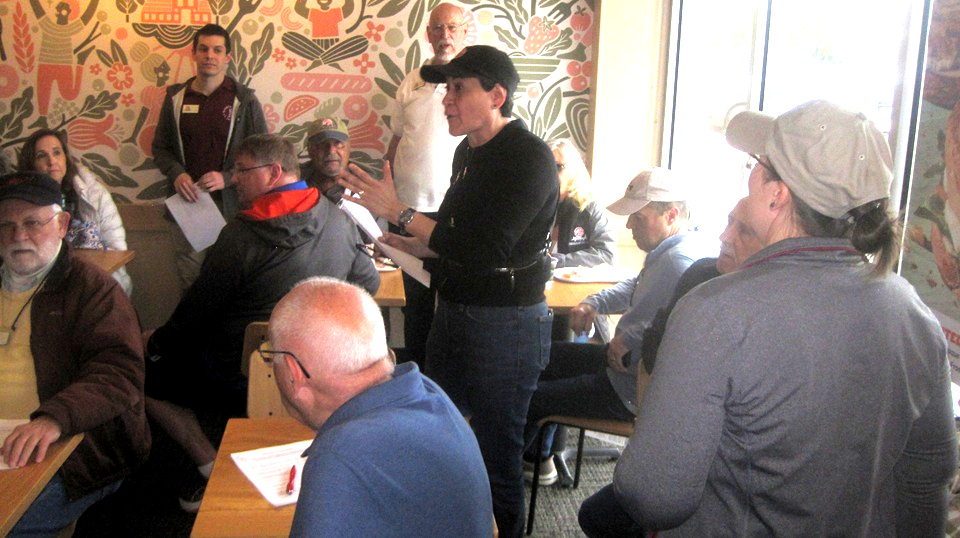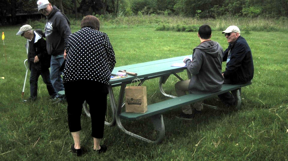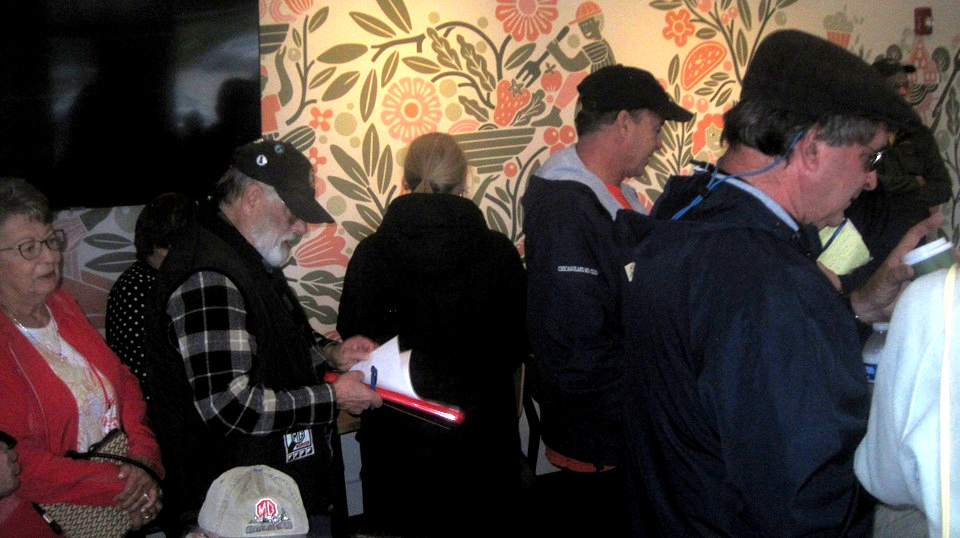 No time for pictures while driving. Five gimmick questions to fill in the blanks, mostly words from signs. Five pictures of things along the way, need to identify the road where they were seen. So far competitive, but easy. Half way stop for fun and games. Four people get dealt 5-cards, turn them up, best poker hand wins 5 points, 3 out of 4 people guaranteed to get zero points. Cute lottery with 75% chance to lose. There was a ring toss game, flip the brass rings over the chicken, a lot like Frisbee.