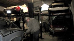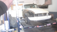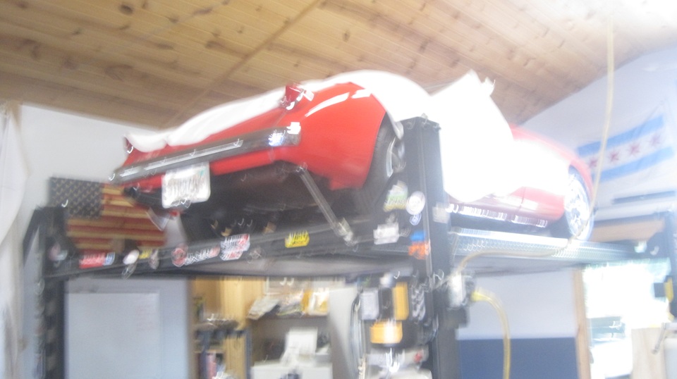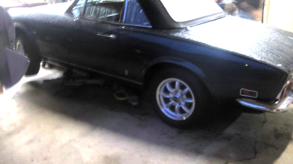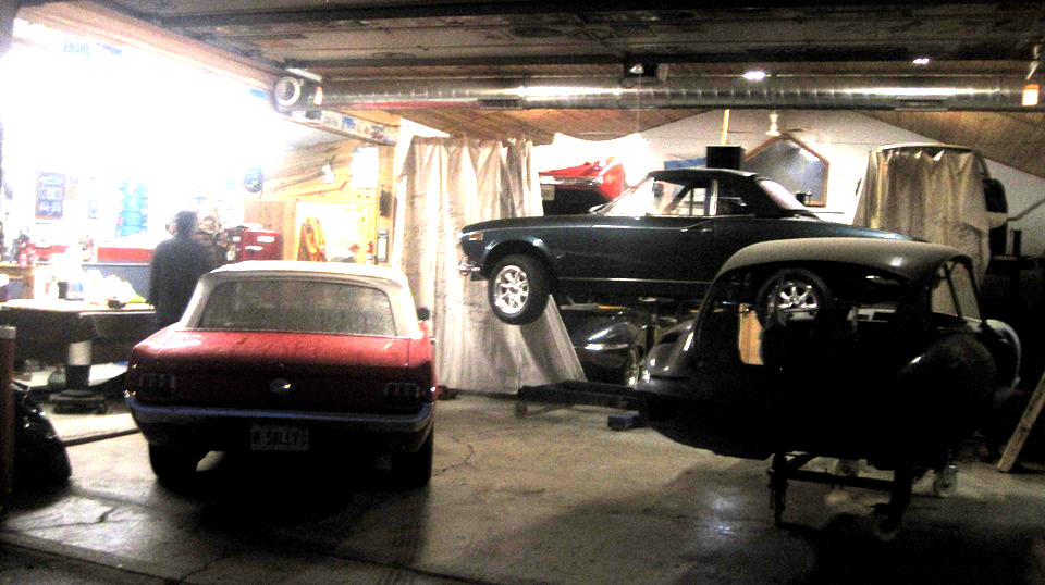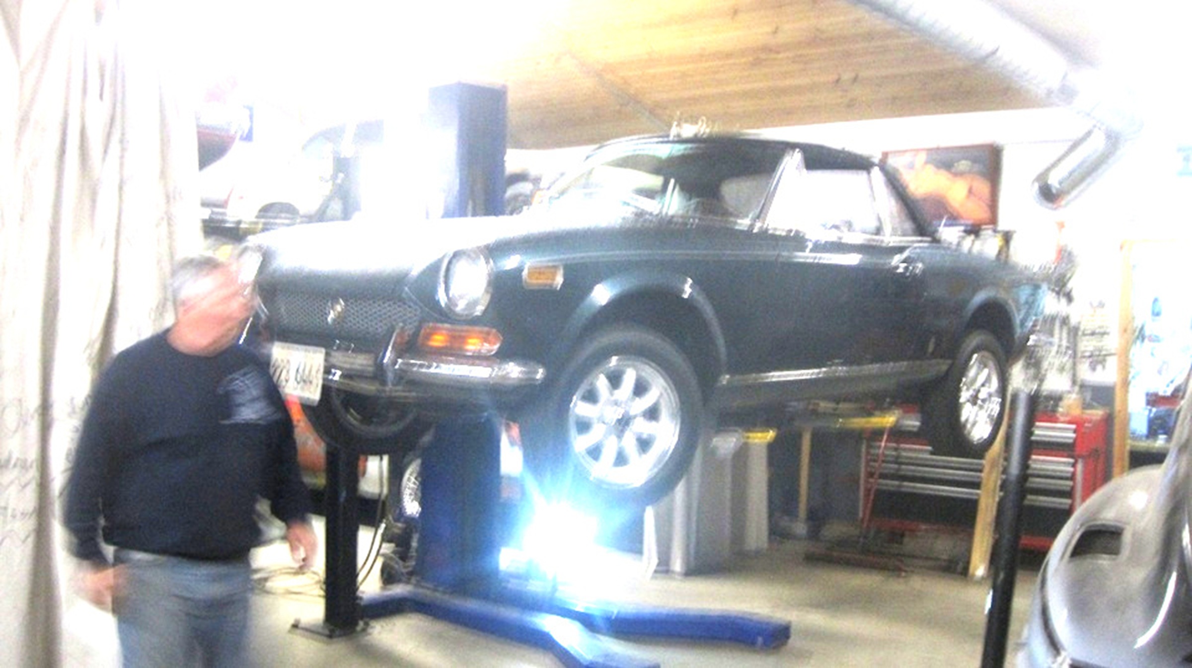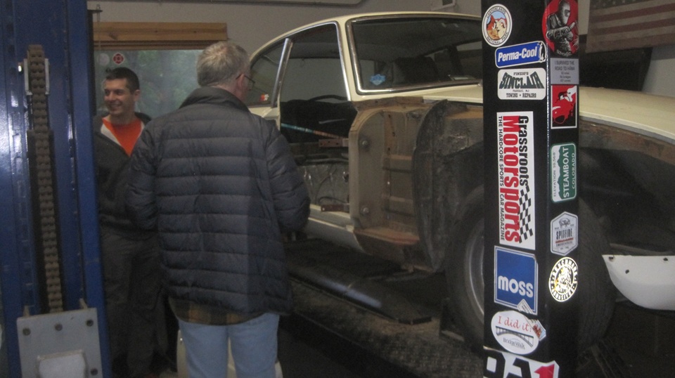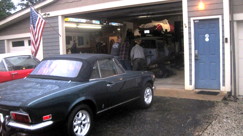 Still in town, so looking forward to Wednesday Night Garage Club. Been rainy and cold for couple of days, must have scared off a few of the regulars. This old camera is not going to do well in the dark atmosphere with poor contrast, so don't expect too much of the pictures.That's Tommy's Fiat 124 and Mustang moved outside for some maneuvering room. Just indoors a few of the guys were lifting a Jag E-Type 2+2 Coupe body shell off of a hoist onto a rolling dolly. Four more cars inside, two up and two down.