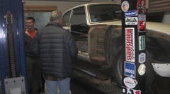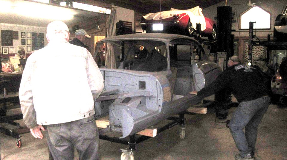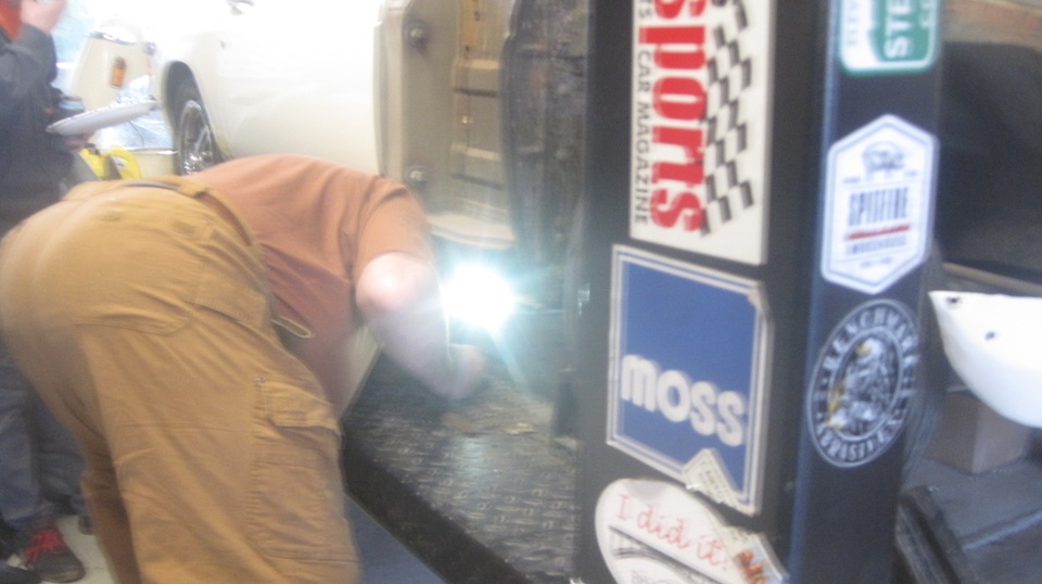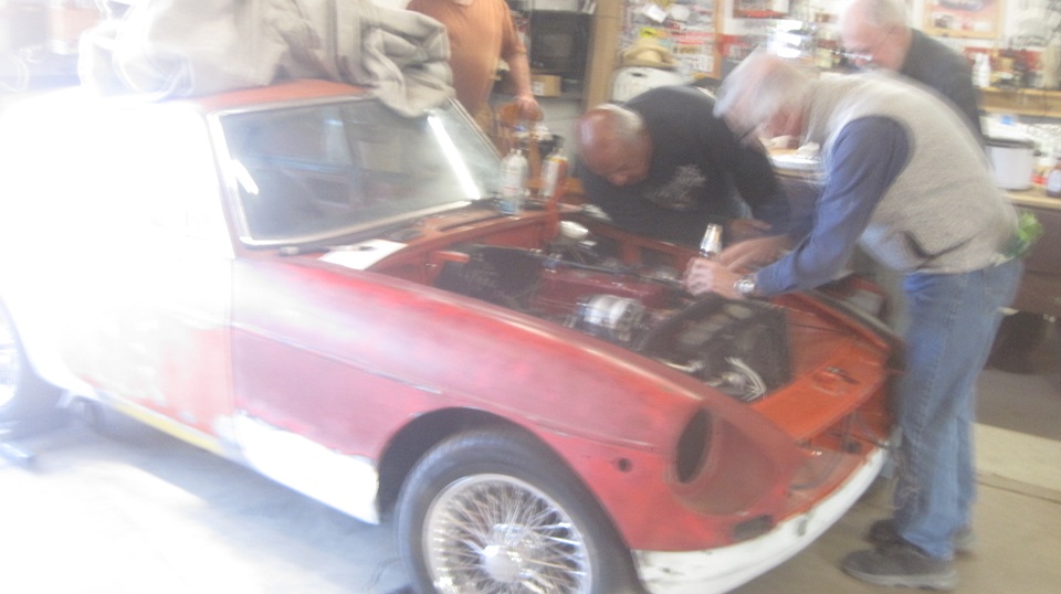 The "kid's BGT" was on the hoist, and after some encouragement and friendly advice it was running briefly. Later in the evening the right side door was removed,and they were grinding some rust on the body sill.