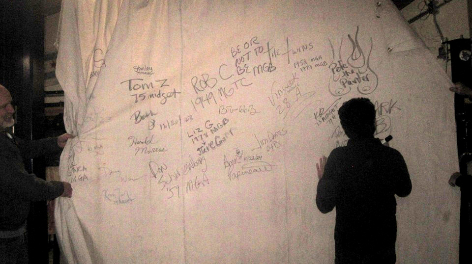 One or two of the new guys need to sign the members canvas. Then moving the portable hoist and getting the Fiat inside.