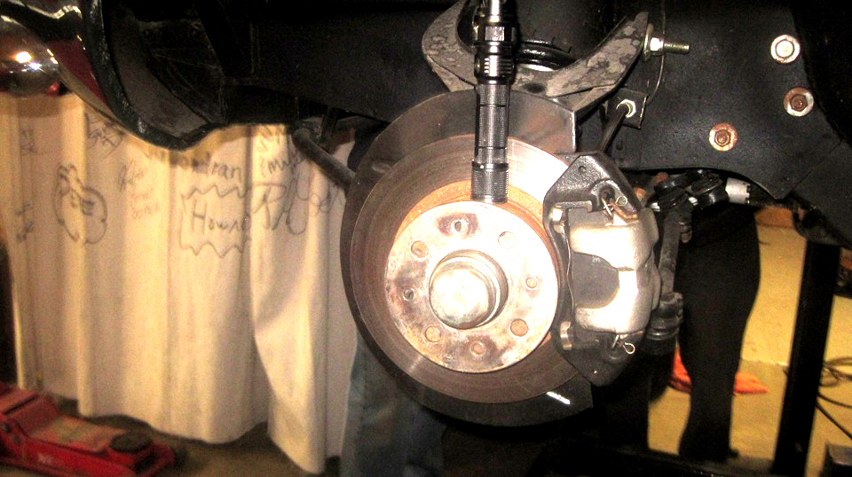 Took a while to get the Fiat loaded sideways onto the portable hoist, and rolled back a bit farther to clear forecourt space. Finally the Jag body and the Mustang found enough space in front to get in out of the rain. Then time to pull the front wheels off of the Fiat to check the brakes, since it had been pulling to the left with application of the brakes. Nothing notable found wrong with initial inspection. Likely to get new brake pads as first move before tearing anything else apart. Then a half hour of social before the party was breaking up and letting everyone back out into the rain again.