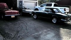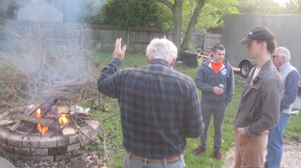 Wednesday Night Garage Club,for the last time this month. One mile before arrival we were poking along in heavy traffic waiting for a red light, when the trailer was struck in the rear again by a new Ford P/U truck. We may be slightly ahead of the odds this time, as it has been nine months since it was smacked twice in 24 hours in California (always a P/U truck). Not too bad a hit this time, so we only gave the truck the middle finger and drove on when the light turned green. Must have done a pretty good job of glassing it back together after the last incident, as it seems to be unscathed this time. -- Three of Tommy's toys were parked outside to allow working space inside.