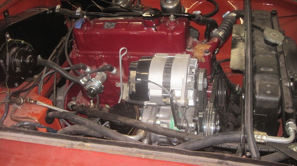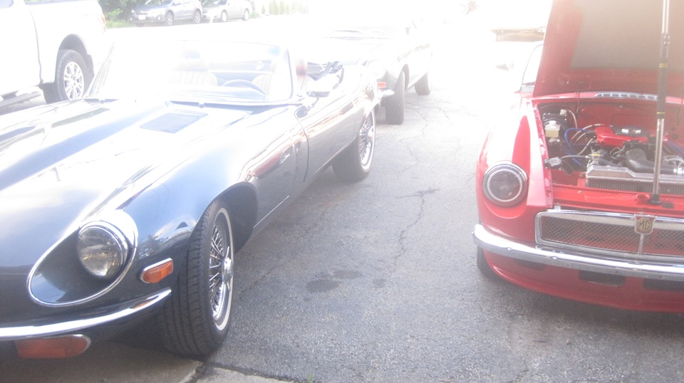 Tommy's MGA as on the other hoist, just parked and needing nothing. the club project car BGT had been pulled out from underneath for tinkering. Looks like it should run, but it only starts if you choke the crap out of it by mostly covering air inlets with your hand, and more of that required to keep it running. Ignition side looks okay, and the alternator seems to work. I notice which I am personally not enthused about. Carefully checking A ll the plumbing