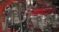 . Fuel supply line connections okay. Float chamber vents left open, not connected,should not be any problem. Front tapped cover vent connected with Y-connector to two hoses in turn connected to correct low level vacuum vents on the carburetors. Looks okay initially, but should check the function later. Small hose for distributor vacuum advance is connected on top of the intake manifold (wrong vacuum source?). Vacuum unit on distributor has vac connection on top, so it would be max advance at idle with manifold vacuum signal, and vacuum goes away when you hit the throttle. That makes it a vacuum retard distributor set-up which I'm pretty sure is wrong. But if you disconnect hose from distributor and plug it to disable the vacuum function, it should start and idle okay. -- Valve cover r has rear vent normally connected to vapor recovery canister, but no canister here, so the cover port is tapped over to plug it. Oil filler cap is vented type with internal filter, which should be okay with light crankcase vacuum. No PCV valve, so crankcase vacuum can only come from the carburetor connections to front tappet cover. -- Only running with abnormally high choke implies fuel flow restriction, but I'm not going to remove the HIF carbs or open the bottoms to check float level. Chore for someone else at another time. -- My best advice for now is that someone (project manager) needs to decide what model year this engine should be built up to, so they can install a full set of matching components and plumbing. there was Dino Perez (hadn't seen him for a while) grinding on a new heat shield, which I think was for the project car. And not a revival meeting, just some social chat after the barbecue.