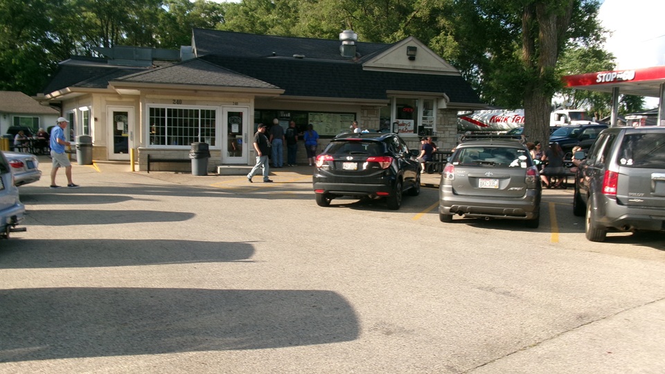 Late afternoon, we have an appointment with some folks from Milwaukee and Great Lakes MG Motorcar Group. Run 40 minutes north to LeDuc's Frozen Custard in Wales, Wisconsin by 6-pm for an event they call "Sundaes on Wednesdays". No little cars around, and just a few guys there when we arrived, so grab some snacks while waiting, Half hour later an MGB came in, and we collectively had half a dozen people.