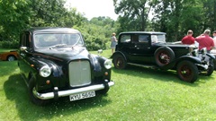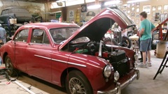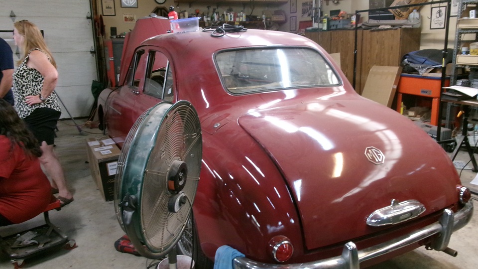 The next black car with wider radiator and very vintage looking wire wheels I also don't know. The red sedan is definitely an MG Z-Magnette well along with restoration, wood dash finished but most of the interior still missing.