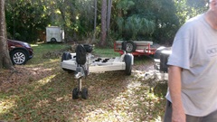 On the side, all hands helping to clear out the side yard so the lawn mower might get through. First the golf cart needs to be towed out, heading for metal recycling. Four flat tires, six dead batteries, right rear wheel locked up, steering very tight (almost seized). Six guys can skid it across the grass to get it out of that nook. The little green lawn tractor is next, heading for the same fate. The light aluminum trailer was in the way, so move a few cars, get the trailer tongue wheel dolly, and move the trailer back between a couple of trees, out of the way.