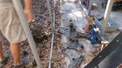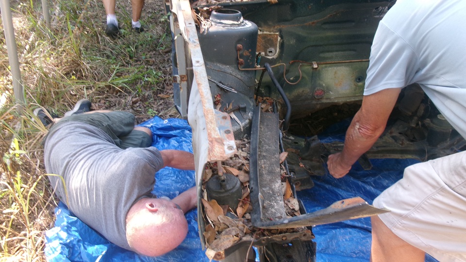 Before the junk VW could be hauled out, they were removing the front suspension cross member and lower A-arms. This was Jerry's pet project, as he had paid $100 to get those parts out of a junk yard once.
