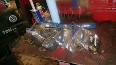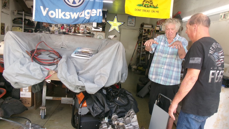 On the work bench the guys were back at replacing another U-joint for the TR6 fear suspension. I think they got that one back together before lunch. -- The Chrysler mini van was in for an oil change. Fun trying to drive that one up the ramps. First time half way up and roll back, no go. Second try more throttle shot both of the ramps half way back under the body. Jack up, remove the trapped ramps, put them back in front of the wheels. Third try, half way up and roll back gain. Would I like to try it? Sure, it's just ramps under front wheel drive, should go right up. Low gear with a little throttle starts up the ramps. Left toe on the brake pedal to moderate gradual progress causes the throttle pedal to go dead. Say what? Try again, a little throttle and a little brake pedal at the same time, and the throttle goes dead again. No kidding, put the pedal to the metal, and it just sits there at idle, until you take your foot off of the brake pedal. Gawd I hate the computer programs in these newer cars, thinking they know what's good for you better than you do. So, not allowed to touch the brake pedal while driving up an incline? Okay, light throttle, just enough to get it to crawl up the hill, and hammer the brake pedal just as it makes the crest onto the flat top platform. Scared the hell out of a few people, but I got it. On the brakes, off the throttle, back in Neutral, and then Park. Damn, remind me never to buy a new computer controlled car. -- Then a short tech session on how different VW gearboxes may have different shift linkages, but Jerry has that one well in hand after shuffling the gearboxes in and out of his race cars too many times.