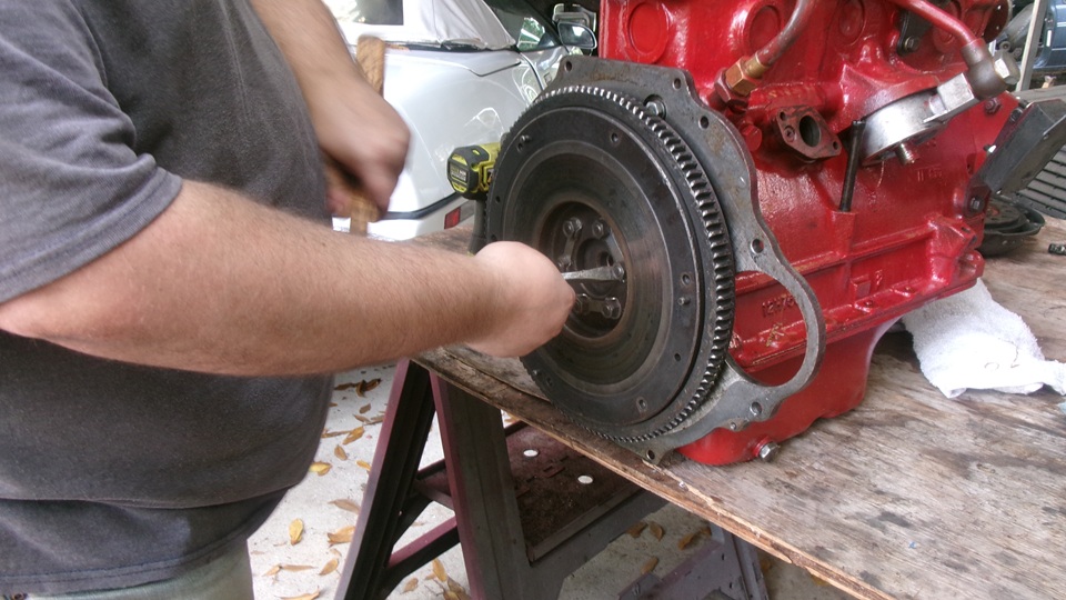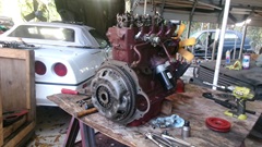 From the rear ,remove clutch, flywheel and engine rear plate. From the front remove crank pulley, fan, water pump, alternator and a few more small bits we will need to install the "loaner" engine. By 1-pm the 1800 engine was half naked.