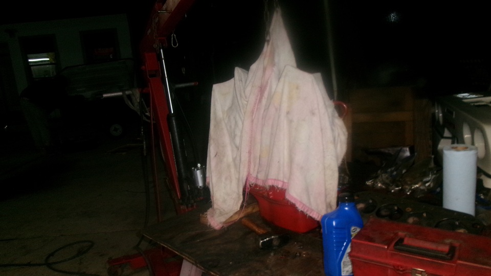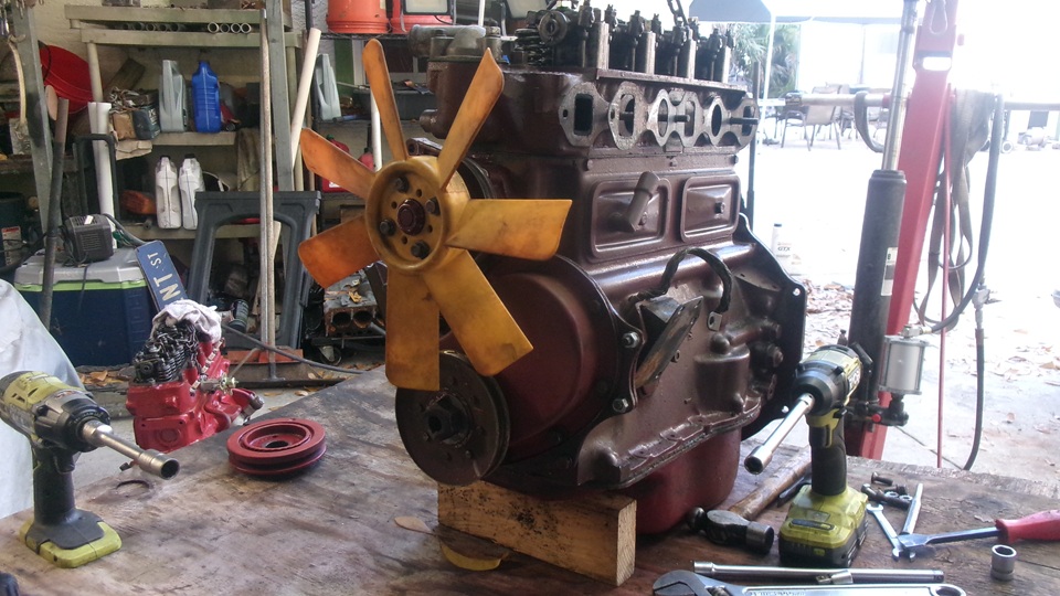 10-am start, drain coolant and oil, remove radiator, carburetors, manifolds, distributor and other peripheral bits. Disconnect bellhousing bolts and engine mounts, lift out, and by 2-pm the engine was sitting on a work table.