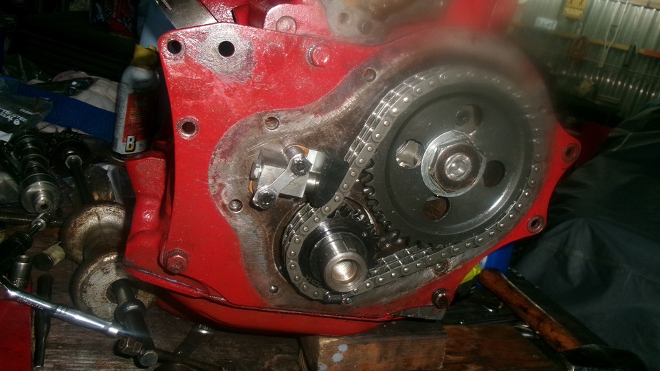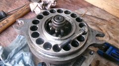 Extract the atchometer drive gear and snap rung and two woodruff keys from the old camshaft to install on the new one. We used a 3-jaw puller to get the gear off, and hydraulic press to reinstall it. Finally the new camshaft was installed, properly aligned with with sprockets and timing chin and tensioner. Before installing the timing cover, we couldn't find the oil thrower ring. After wasting nearly an hour searching everything, we gave it up for lost cause in the dark, and installed the cover with loose screws, to be taken up later. Wet, windy and hilly here. Drop on a head gasket and the head and rocker assembly and valve cover to close it up for the night. Leave it hitched to the engine hoist, throw a towel over it, and call it good for the night.