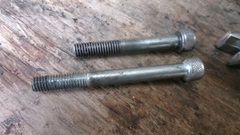 There are two socket head cap screws securing the end plate to the body of the motor. One screw was quite loose, one screw was flt out missing. Amazing he thing still had some sort of electrical ground, as it was still working. The more immediate problem was, these are metric screws, 6x1-mm, 45-mm long. Dang, where would we get one of those when we couldn't drive to hardware store? Jerry runs a couple of VW race cars, so he might have some metric fasteners. We were searching around the shop for half an hour with no luck, thinking we may have to reassemble it with only one screw, and get it out again later for the final fix. Then out of the blue Elliot hollered, "Hey. I think I found one"! I have no idea where it came from, but he was holding a 6x1x60-mm socket head screw. The rest was easy. Grab a threading die to run another half inch of threads down the shank, then cut it to length and grind the tip smooth. Got it all back together with some thread lock adhesive, and it only killed about an hour.