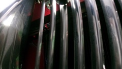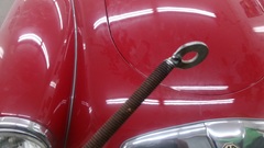 We had the latch pin pusher tool from last week, and the car on a lift for much easier access in front, much more workable. We tied back the bonnet release pull rod, spread the grill fins slightly, and spent an hour or more poking the bottom tip of the latch pin around with some vigor, but still no luck. then we pulled out the parts list diagrams to study the assembly, and checked some pictures of the latch from my web site. We finally figured out that the bottom plate of the bonnet latch was installed wrong, swapped end for end, so the blocking tab underneath was on the wrong side of the latch pin passage port. The picture below right is correct (see tab in red circle). The red coupe has this tab on the opposite side. That allows the latch pin to be pushed off center by the spring drawn latch slider so if the bonnet is pressed down a bit too far, the tapered latch pin head can be caught below the edge of the bottom plate.