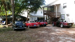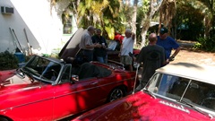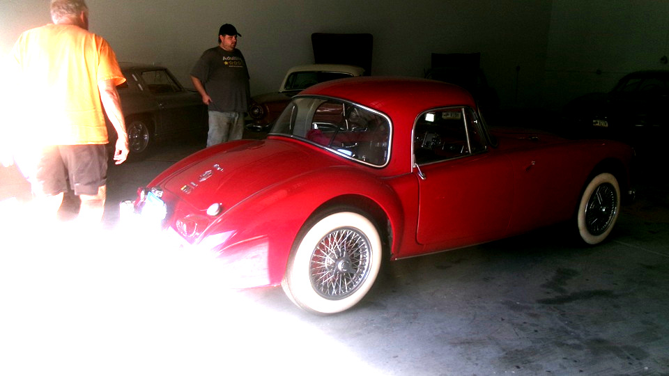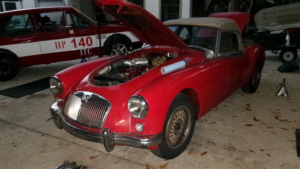 on Fri Jan 3 we were working on right rear brakes of an MGA 1600-MK-II Coupe at Tech Central. On Jan 30 we were checking out the stuck bonnet latch while the car was in for paint touch up in Bonita springs, FL. Today we were off to Fort Myers, FL to visit the red Coupe at its home base where we had a drive-on lift to help with access to the stuck bonnet latch. The Coupe drove home from the paint shop, but died at the door before entering the shop. Turns out it ran out of fuel, so a few gallons of gas got it running again, so it could be driven onto the lift.
