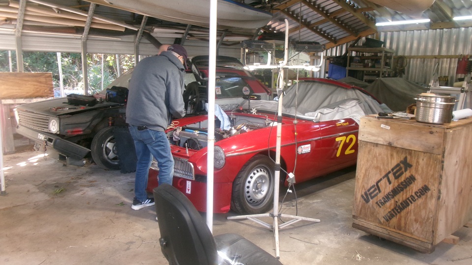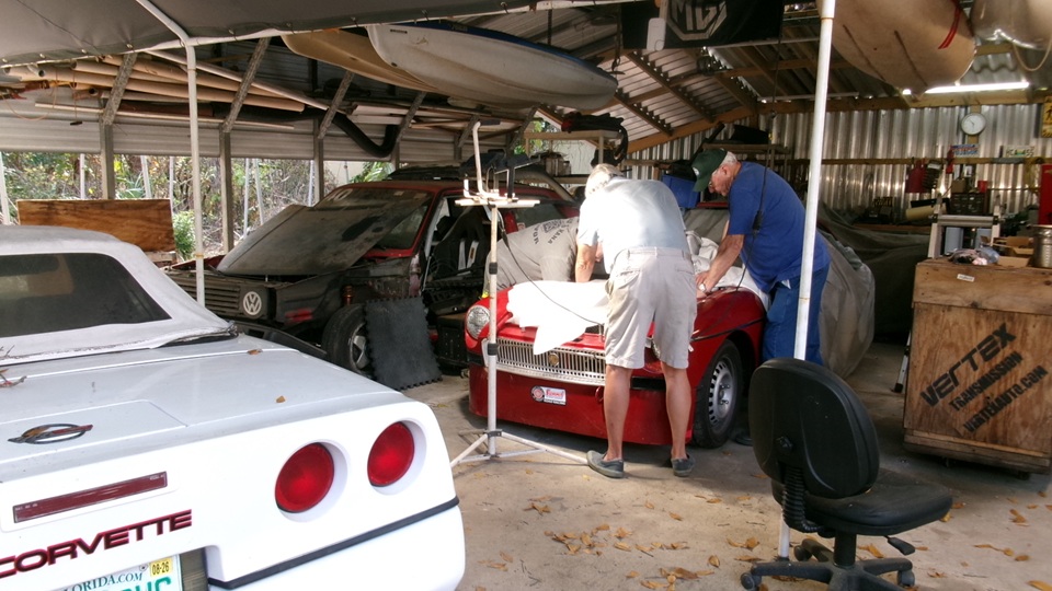 The Corvette is waiting for a new battery to be installed before diagnostics to track down a slight power drain when switched off and parked. Tina the rookie race car was getting carburetors reinstalled after getting the new dual valve springs. This went well, and the engine fired right right up and ran well.