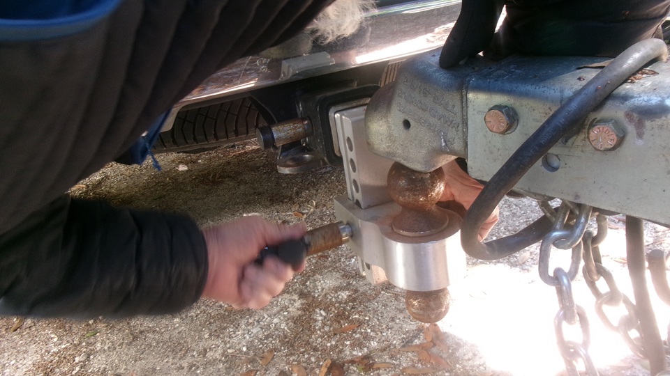 That solved the mystery of how and why the latch was stuck. but we did not get it unstuck, yet. The pusher tool with the washer welded on the end was not quite strong enough to pull the pin forward and in the direction toward the stop finger, so we needed a different tool. Think giant flat blade screwdriver with 15 to 18-inch reach. That may be able to get behind the pin to push it forward and back toward center. Unfortunately we don't have that tool handy, so this project will wait for another time.