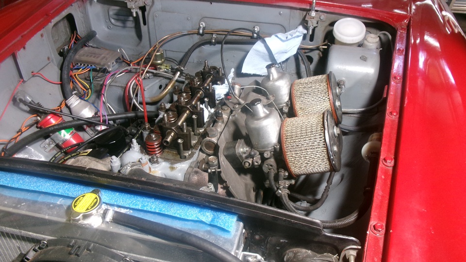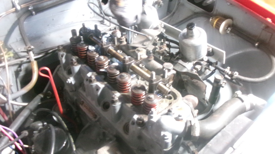They have this neat 4-bolt plate tool to attach to the carburetors to R&R them as an assembly, keeping the choke and throttle linkages together. During the process they did not find the half piece of the split cotter, so either it never fell in, or it may have found its way down though an oil drain hole to the sump, where it will do no harm anyway. Once the tappet cover was reinstalled, and the manifold and carbs were back in place, it was enough for one day. When almost everyone had left, two more friends of the friends showed up with a Porsche GTS and a Jag E-Type. Hello and goodbye, lock up and we're out of here.
