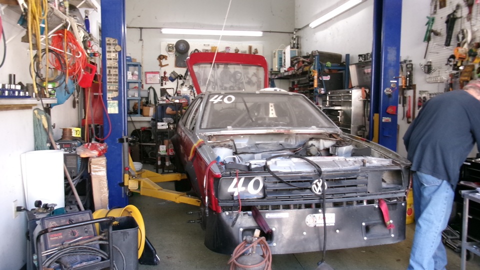 Good morning Tech Central Racing. Don't be fooled by two VW with the same racing number. They never get out on the same race dates.The one on the forecourt is the Rabbit that returned from Daytona with a broken shifter last week end. On the lift in the shop is the Scirocco with engine out for a while, and Jerry in the back tinkering with the engine.