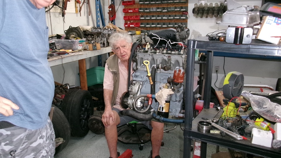 Bit of a crowd and tight parking at Tech Central on slightly late arrival. We have driven the MGA all of 12 miles with the new rod bearings and clean oil, and the oil pressure is perfectly good like 70-psi at idle with cold oil, 50-psi at idle when warmed up just a bit. But as my skeptical navigator is fond of musing, we will have to wait to see if it holds up, or which shoe might fall next. The racing Rabbit has received some new engine mounts, currently needing some alignment for one more bolt to be installed.