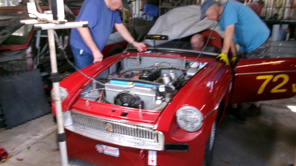 My new radiator that doesn't fit has been moved farther back on top of something else, because the guys wanted to use the engine box as a work bench. Tina, the MGB race car was getting some attention. This is the second Friday they have been trying to change valve springs from single to double springs. They do have all of the correct parts required, but they are still going to the School Of Hard Knocks, trying to change the valve springs without removing the head. Just a hobby, maybe, as they want to spend more time than money, to save the cost of a new head gasket. Today they removed the rocker shaft assembly (loosening four head bolts) to remove the rocker arms, then reassemble the shaft and pedestals.