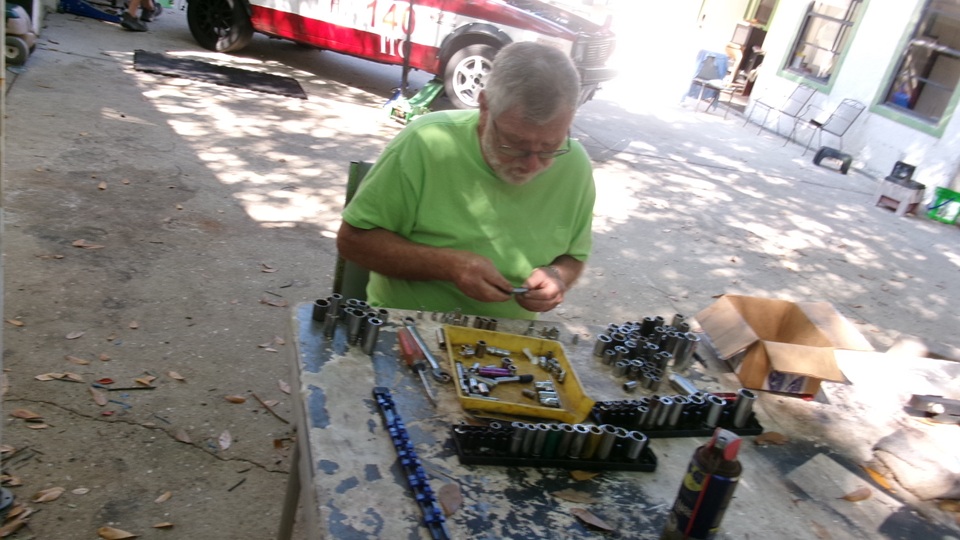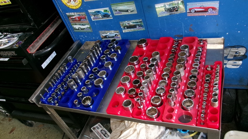 Some of the guys, not too busy, having a committee meeting, scratching heads, no doubt chatting about the TR6 again (the never ending issue). Another repetitive issue, sorting sockets, because people never put them back where they belong. Seems like they have now procured some better socket clip strips, easier to use. An hour later things were looking much more organized.