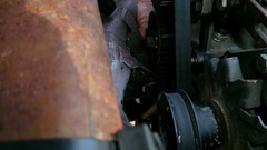 Our one serious goal today was to change the worn connecting rod bearings in the MGA. Feeling confident we can get this cone in one day, we arrived late morning, about 11-ish.Give the Rabbit a little nudge so we can pull the MGA up in front, jack it up to set on four stands, a little higher in front this time, and front wheels off. Not long to drain the oil and remove the filter. Also remove two bolts at bottom of the bellhousing, as the oil pan has to drop down that far in back. 19 quarter inch hex head screws would be a breeze with a small power wrench, except that five of them in front are very close quarters above the front suspension cross member. Three in the middle can be removed with socket tools with a quarter drive U-join. The two front corner screws can only be reached with a 7/16" offset box end wrench, and maybe thin double jointed fingers. But been there and done that before, so just knowing it can be done is good encouragement. Given an hour of persistence, the sump was removed, along with the oil pump and pick-up screen. Swapping the connecting rod big end bearings was straight forward, knock back locktabs, remove two bolts,and the bring cap with half shell is in the hand. No spun bearings, but the shells were through the white metal, touching the copper, not yet through to the steel.The crankshaft journals seem to be okay, very lucky at this stage. of wear.