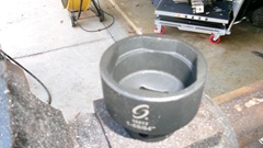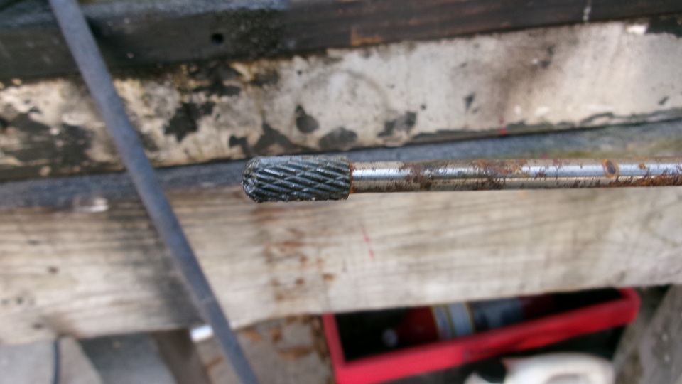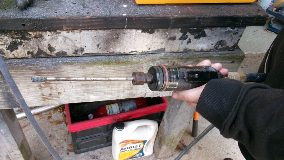 On to my more interesting task for the day, "porting out" the new 1-59-64" 4-flat wrench socket to fit the 1-15/16" octagonal nut for the rear wheel bearing hub. I have never ported a cylinder head, but at least I get to use the tools. Enter the air powered die grinder, which might be overkill, but sure makes this job easy.