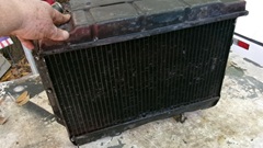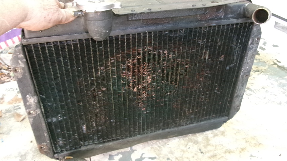 After half a day messing with Part Numbers tech pages for studs, we got a phone call saying my old radiator arrived from California. So we dashed off to Tech Central to grab the package, unpack the prize, clean and inspect it, and get it installed in the car. there are some missing fins near center of rear side of the core, possible aggravated by garden hose flushing out dirt back to front. Also too many fins too close together, somewhat obstructive to air flow. And the shallow filler neck I had installed about 30 years go so I could use the coolant recovery pressure cap. Not too bad for a 40 year old re-core that has been damaged and repaired a few times.