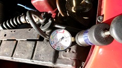 The good news is, it holds up to a pressure test. and we drove it several miles with a pressure cap installed, without losing water. So maybe in a couple more days we may get bold enough to put glycol coolant in it,and see how long it can stay there. -- Add a few minutes to reconnect a wire on the turn signal switch, and verify (again) that the miniature relay used to make 4-way flashers work has a burned contact, needing to be replaced (again). Job for another day.