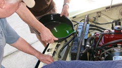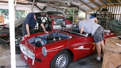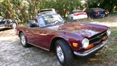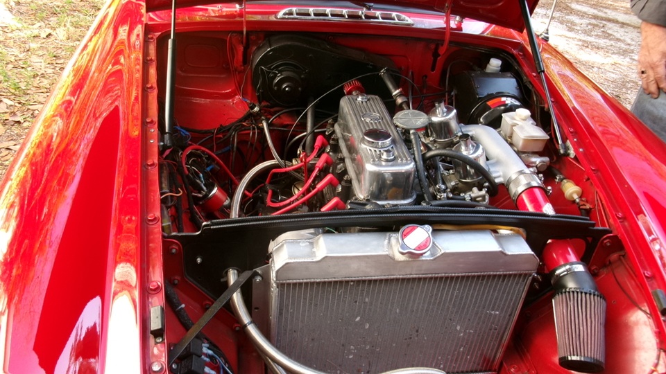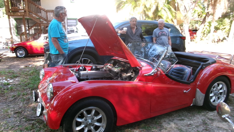 Question, can you replace a camshaft in an MGB without pulling the engine or removing the sump? Answer, yes, but you have to remove the radiator, displace the oil cooler, remove carburetors and manifolds, valve cover and pushrods, side covers and tappets. Also remove crank pulley, timing cover, tensioner, sprockets and chain, and the camshaft front retaining plate. That was about time the questioner declared that his friend could do it himself. Some discussion about this TR#with aTR6 front frame and suspension and rack and pinion steering gear, fat tires and 2-inches of ground clearance. Don't try to drive over a speed bump.