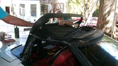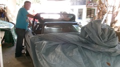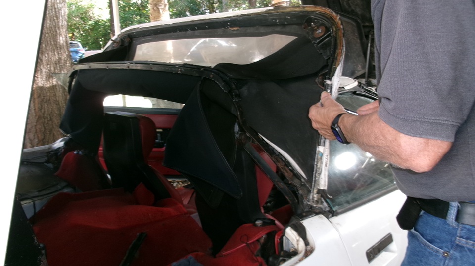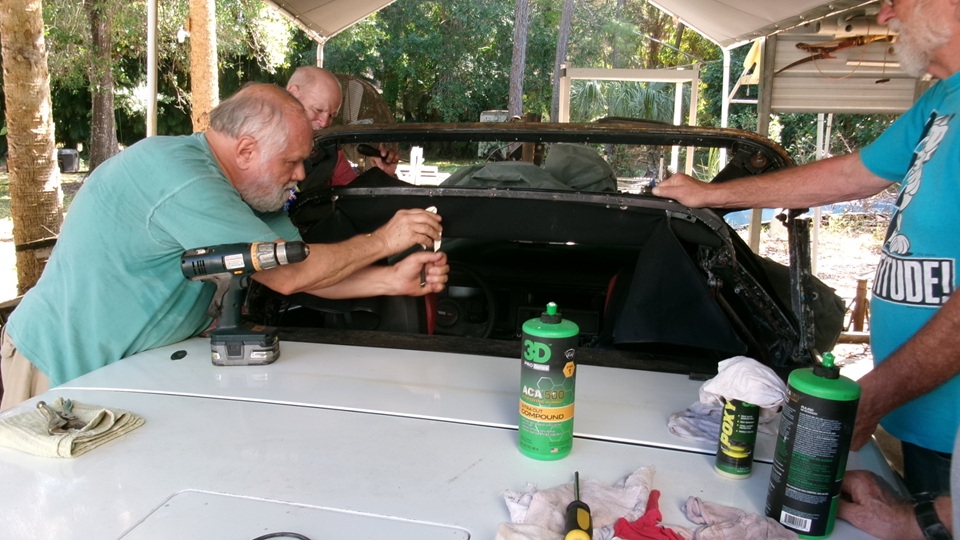 The Corvette rag top was turning out to be a lot of work, even though the owner had done it before on this same car. Stubborn corroded screws, some pop rivets to be drilled out, and a couple of long plastic inserts that didn't want to be driven out, even though they were supposed to be hand push parts. Turned out to be couple of errant pop rivets embedded in the middle of the plastic parts. Live and learn. They will be back next week for more.