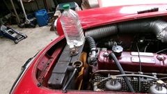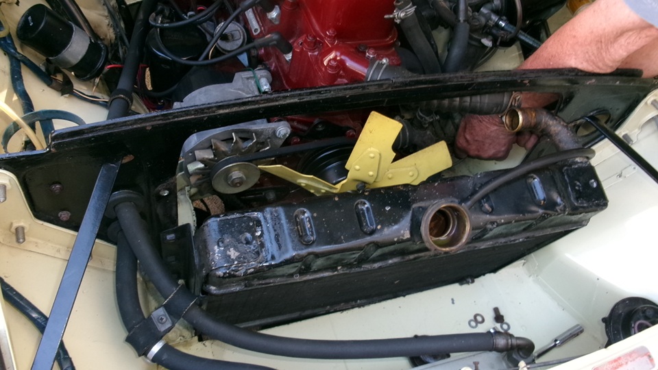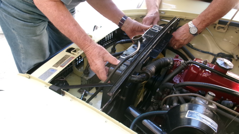 Good turn out for tech day. The yellow MGB GT was getting some attention, like it was about to get a new plastic fan shroud installed, because it had been running hot in slow city traffic. One look under the bonnet, and I had to tell the owner the cooling fan was installed backward, which may well account for a deficiency in air flow during city driving. If they just flip the fan blade around with correct side forward, maybe it doesn't need the fan shroud. Well, they already have the fan shroud in hand, so might as well do both while the radiator has to be displaced some to do either one. Next picture shows a hose off and the radiator unbolted and pulled forward, and the fan swapped around the right way. That was pretty easy.