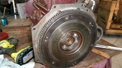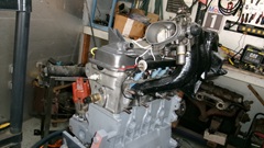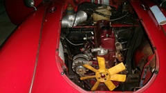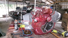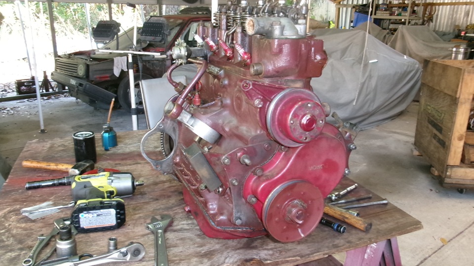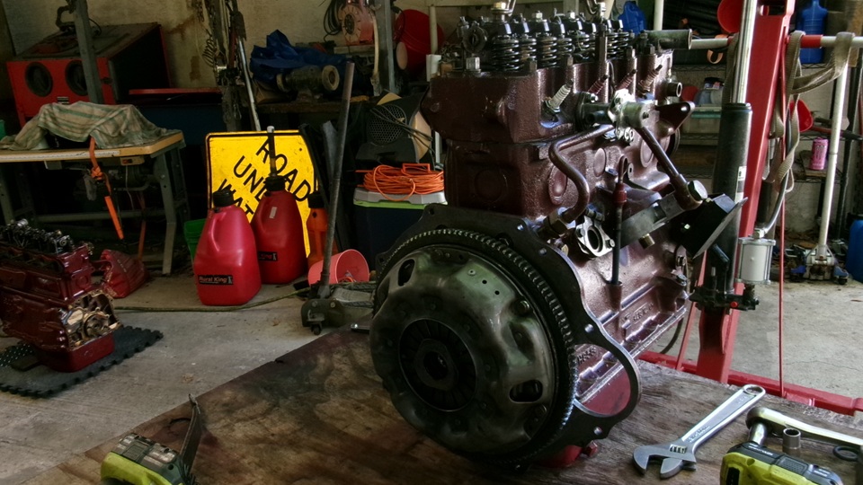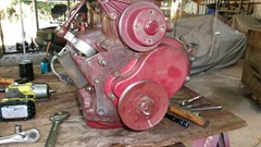 Pull the 1500 engine out of the crate, set it on the work table, swap the front pulley,and install rear plate, flywheel, clutch and engine mounts. Carefully set the 1500 into the car, bolting up bellhousing, starter motor and engine mounts. Days are getting slightly longer with change of seasons, so we worked until near 630-pm. Got a bit farther long than anticipated, installing exhaust and intake manifolds, water pump pulley, fan,alternator, oil pressure signal hose, distributor and oil filter. Not enough light left for carburetors, so quit there for the night.