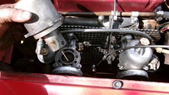 When the sun popped up it was warming up in a hurry. Taking up where we left off, not long to install the carburetors, then changing of the guards, reinstall the GS needles for the1500 engine. By noon the radiator was in, filling with water, and by 12:30 it was running. Peachy.