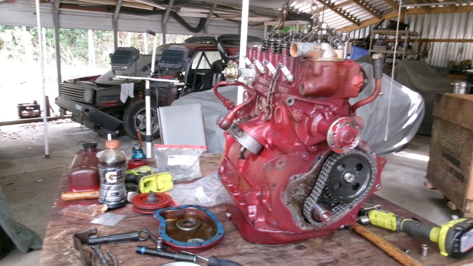 I warned you we would be busy, which means we may not get very many pictures. The short of it is, since the 1800 engine with replacement crankshaft developed a rod knock again, after eating all of the rod bearings once, it was now coming out again to have the crankshaft reground (again?). A little late starting, maybe 10:30, drain fluids, remove peripheral parts, and pull the 1800 out of the car. strip off clutch, flywheel,front pulley and engine mounts, and set it aside.