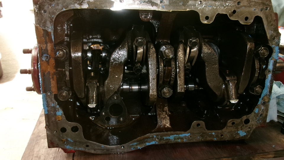 Okay, get the crank out of the block. Bend back all of the lock tabs, remove #2 and #3 big end caps first, bagging and numbering each separately along with the half shells, and push the pistons full up into the cylinders. Turn crank half turn, and repeat with #1 and #4 big end caps and shells,and push those pistons full up into the bores. Then pull the front and rear main bearing caps, and bag those. Last, pull the center main cap and half shell, along with the thrust washers, and bag those. That left me holding the crankshaft with two fingers against the last three half shells. Carefully pull the crank out and set it on the table. This is to demonstrate that you can remove the crankshaft without removing the cylinder head or pistons. -- Collect and place all of the loose parts into the oil pan, and place it between the engine and crankshaft before covering it all with a tarp, not just to keep the stuff protected, but also to discourage anyone from trying to move the table.