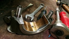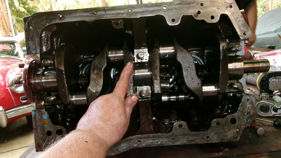 Pick up the 1800 and set it on the work table, rear plate and front pulley already off (in the car). Remove the timing cover, tensioner, sprockets and chain, cam retaining plate, and engine front plate all quick work with a power wrench. Lay the engine on its side,and remove the sump and oil pump, also quick. The truth is close at hand as we begin to remove con-rod big end bearing caps. Number 1, 3 and 4 rod bearings in decent condition. but #2 half shells are down to copper,and the crank pin journal is toast with scratches to catch a finger nail. I recon it was like that when we slapped in the new set of rod bearings two weeks ago, and this never had a chance.