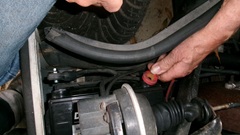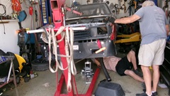 the guys got to work with the pneumatic bellows jack, which actually works quite well once you get the hang of it. Sometimes it may seem a little wobbly half way up, but it is easy to use and has nice high lift. Just be sure to use a good jack stand along with it. With one guy pushing pedal, one guy working a vacuum bleeder, two guys regularly refilling the small clutch master cylinder reservoir, it wasn't long to get the job done, and the clutch works well with no new parts required.