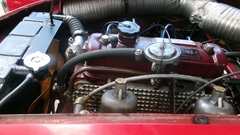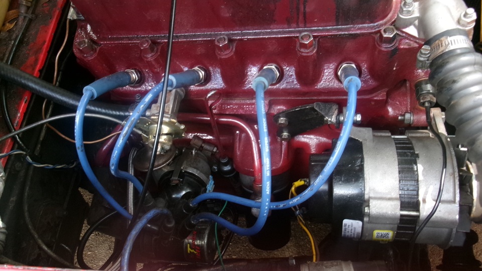 One sad boo for the day, the new pre-engage gear-reduction starter motor didn't fit in the car. the motor housing extended on one side is clocked wrong, so it hits the steel clutch hydraulic pipe, just above where the clutch slave hose bracket is welded on the unibody. Gawd, I feel bad for this guy, after my recent fiasco with the new MGA radiator that didn't fit in the car (and still hasn't been returned). The old (black) inertia starter recently removed has a very badly worn pinion gear (and worn ring gear as well) that is on its last legs and will jam frequently. We groused around in the attic to find another (red) similar inertia starter with a much better pinion gear. We are all wondering if this is the one removed from my MGA when I installed a gear reduction starter several years ago (maybe). Connecting them to a battery jumper box had both jumping to life equally well, so the red one was installed in the car with a prayer and a song, as they are not pulling the power unit again to change the ring gear. With several starts, this one only jammed once, so that should get him by until he can exchange the new incorrect gear reduction starter for the correct model. All said, put the jumper battery box back in the shop and plug it in to recharge.