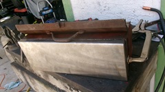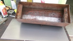 Off to Tech Central again with a bit of a mission (or hobby). We will try to repair (rebuild) a 50 year old steel hip roof tool box. We are rather fond of this box, because of its thin walls and space efficiency (and limited space in the Magic Trailer). You can't buy a replacement like this any more. The problem is, the trailer is often wet inside,so the toolbox has been rusting badly. We have not been able to pick it up for three years, as there is no bottom left in it. After inspection, the first move was to cut one inch from the bottom of the side walls all the way around. And lots of penetrating oil on the lid piano hinges.