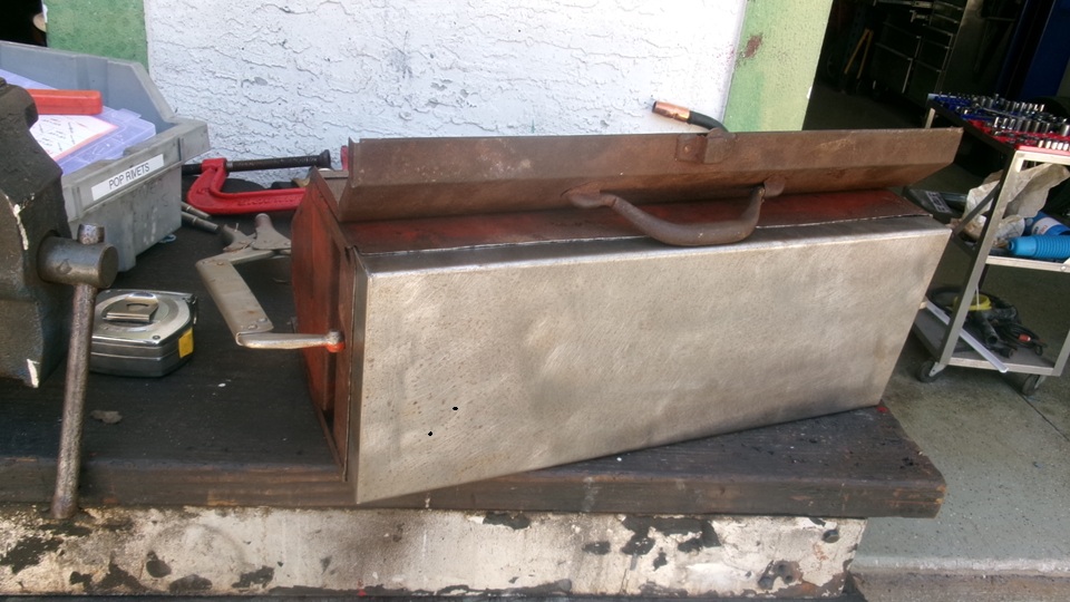No need to cut the tray down, leave the 1-1/2" overlap, and put two pop rivets in each end to hold it in place. No spot welder handy, so spend some time with the MIG welder stitching in tack welds every 1/2" at the edge of the new metal inside, both sides (not at the ends where they hide inside under the end shelf gussets). Then more tack welds all around the outside to secure the bottom edge of the old metal. Then half an hour with a flap wheel sander in an angle grinder removing sharp burrs from all the tack welds. Some of the original spot welds for one of the hinges had broken loose along with some slightly bent edges at top of the side wall, so more time with clamps and tack welds to re-attach the hinge. Then what must have been two hours with a Scotch-Brite wheel in power drill and the flap wheel sander, buffing off all of the old paint and rust inside and out (should have been a sand blasting job). After digging ourselves out from under a ton of grinding and sanding dust, blow away remaining dust and wash the box down with lacquer thinner, like clean enough to paint (but not yet). It was looking pretty good, so time for pictures.