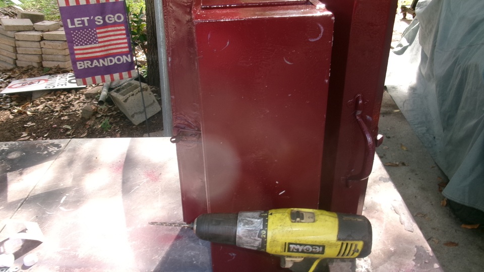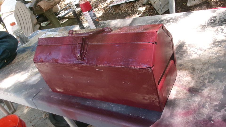 Nothing as boring as watching paint dry, so this will be a short work day. Grab a couple of paint cans, and spray something red on the tool box, inside and out, and on the bottom, top, handle and latch parts of course. Sitting on four large hex nuts so it doesn't stick to the table. Set that aside under the canopy, and we will get back to it again another day.