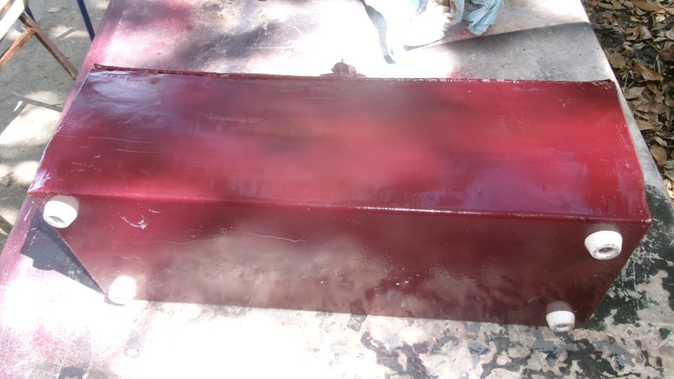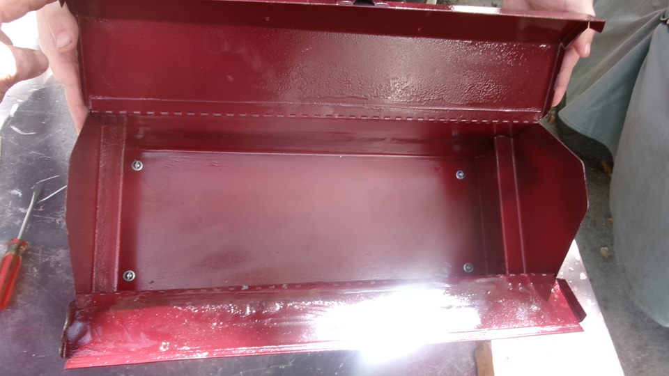 That was the easy part, just spray the primer from an aerosol can. Spray inside first,working through all of the inside corners with blow-back. Spray inside the covers, and over the ends where the cover will overlap, then close it up so we could hold it by the handle. Sitting just over the edge of the table, spray around all for sides. Tilt it 45 degrees on the edge of the table, spray half of the bottom, rotate 180 degrees to repeat on the other half of the bottom. Holding it high by the handle, spray one last pass around all of the bottom corners,and set it down on four big hex nuts. Flip the handle over a couple of times while spraying that last. Wow! That's a lot different from what it looked like yesterday morning.