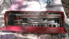 Finally it has plastic feet, so it does not have to sit on the damp floor in the Magic Trailer. The center picture below illustrates the space efficiency advantage of the thin wall sheet metal box, with interior space nearly equal to the overall space it occupies for traveling. Then we begin to load it up, beginning couple of drill index, a manual impact driver, and the 1/2" drive socket set I have had since 1968, and a few more oversize sockets. The 19" long box easily holds 18" long big-boy tools. The lift-out tray gives quick access to the stuff underneath.